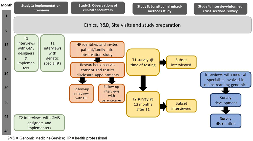 This will be a four-year mixed-methods research programme using clinic observations, interviews and surveys. Study 1 consists of qualitative interviews with designers/implementers of the GMS in Year 1 of the research programme, along with documentary analysis to understand the intended outcomes for the Service. These will be revisited in Year 4 to compare intended outcomes with what happened in practice, and to identify barriers and facilitators that were encountered along the way. Study 2 consists of clinic observations (pre-test counselling and results disclosure) to examine the interaction between health professionals and parents, along with follow-up interviews with both after each observation. Study 3 consists of a longitudinal survey with parents at two timepoints (time of testing and 12 months post-results) along with follow-up interviews, to examine parent-reported experiences and outcomes. Study 4 consists of qualitative interviews and a cross-sectional survey with medical specialists to identify preparedness, facilitators and challenges to mainstreaming genomic testing. The use of theory-based and pre-specified constructs will help generalise the findings and enable integration across the various sub-studies.