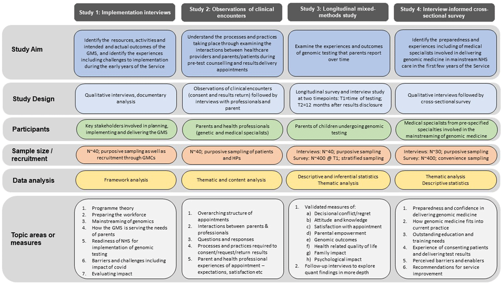Our mixed-methods approach will provide rich, comprehensive insights into the facilitators, challenges and barriers of delivering the NHS GMS. Examining both parents’ and health professionals’ experiences will ensure that experiences and outcomes are explored from multiple perspectives. In designing this study, we have engaged with patients as well as other key stakeholders such as health professionals and policy makers at inception to ensure the research will provide important insights for service improvement and to increase the likelihood that the recommendations will be adopted by policy makers. Our advisory team also comprises a broad range of expertise across genomics including geneticists, genetic counsellors, clinical scientists, behavioural scientists, ethicists, health economists and policy makers who can provide critical insight into the study findings and ensure they are fed back to relevant parties in a timely manner. A key challenge for the project is that there are multiple sub-studies that require buy-in from health professionals across a range of specialties. Moreover, the covid pandemic has meant that many research projects are taking longer to get approved and there have been delays in getting the NHS GMS up and running.