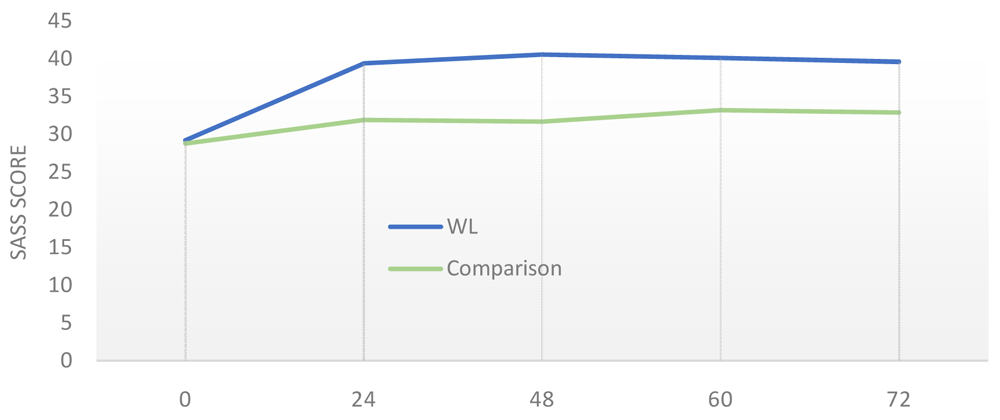 When the 79 study participants were rank ordered, according to degree of improvement on the SASS between Week 0 and 60, the top 10 responders at Week 60 included 8 WL participants, while the lowest 10 (i.e., those whose SASS scores had deteriorated the most) included only participants from the comparison group. It is also notable that one person in the comparison group had a 41-point increase on the SASS between baseline and week 60. While there is no a-priori reason to remove this case, nor treat it as an outlier, it was very uncharacteristic of the comparison group as a whole.