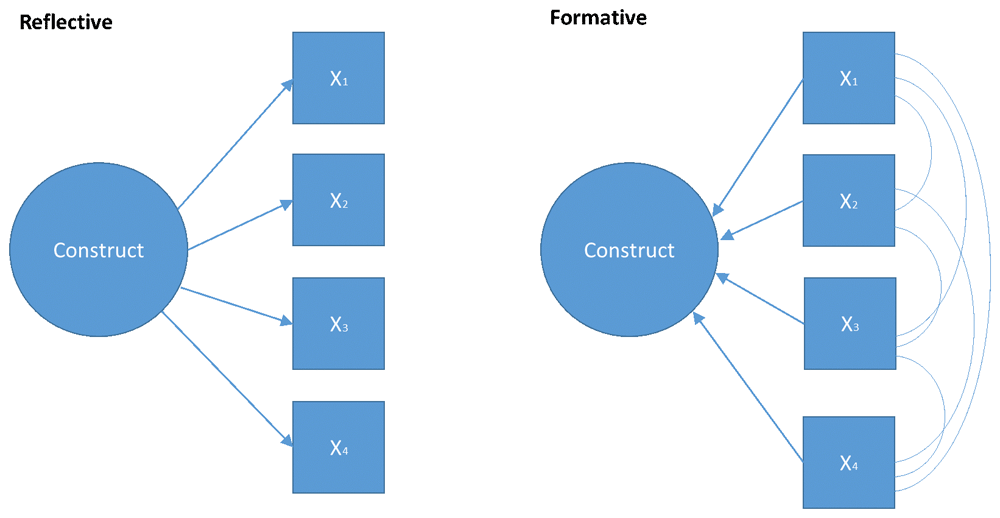 The two measurement models commonly applied in psychometric research are reflective measurement models (RMM) and formative models (FM) (see Figure 1). In RMM, the construct is the common cause of items (observables), i.e. the relationships between the items are due to a common causal path to the construct, not interrelationships between the items. Compared to RMM, the items in FMs are conceptualized as a set of independent measures that come together to form a construct. The items may be inter-correlated. These models also differ in underlying philosophical assumptions. RMMs are based on a realist stance; the construct is conceptualized as being ‘out there’, but unobserved. By contrast, FMs are based on a constructivist position; the construct is a rational construction of the mind and is a theoretical composite of its constituent parts.
