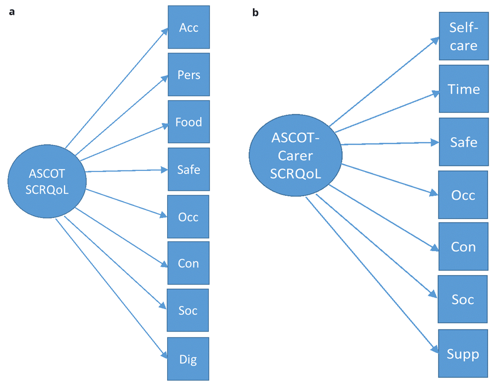 The ASCOT and ASCOT-Carer are best described as formative/mixed or mixed models, respectively. These findings may guide the approach to the validation of cross-culturally adapted and translated versions. Specifically, we recommend that EFA be applied to establish structural characteristics, especially if the measure will be applied as a PBM and as a measure of SCRQoL. Network analysis may also provide further useful insights into structural characteristics.