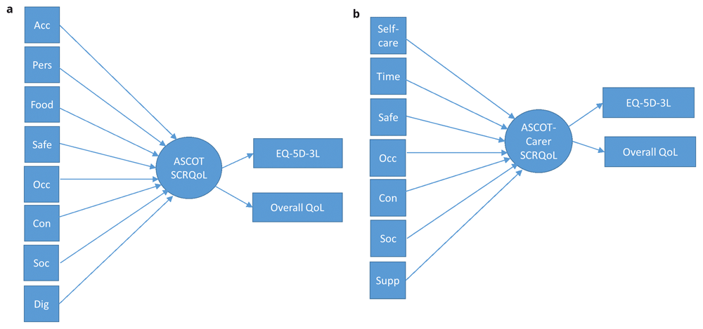 In the mixed models (see Figure 4), the ASCOT or ASCOT-Carer items were considered as formative or reflective. These were selected based on theory. In the development of ASCOT, it has been noted that the domains may be categorized as those that relate to: (1) basic domains that relate to basic care needs/support to sustain life and health (i.e. Food and drink, Personal or Accommodation comfort and cleanliness, Personal safety (ASCOT); Self-care, Feeling supported in the caring role, Personal safety (ASCOT-Carer)); (2) higher order domains that relate to aspects of QoL beyond basic care needs and/or relate to a person’s sense of self and identity (i.e. Control over daily life, Occupation, Social participation (ASCOT and ASCOT-Carer); (3) domains related to how the delivery of care affects a person’s sense of self and identity (Dignity (ASCOT) or Time and space to be yourself (ASCOT-Carer))33. The basic domains were considered as formative, since they may be conceptualized as constituent parts of social care-related QoL (i.e. aspects of QoL that make up the construct, SCRQoL). The higher order domains and the domains related to sense of self and identity were considered as reflective of SCRQoL (i.e. they are driven by a common factor, SCRQoL).