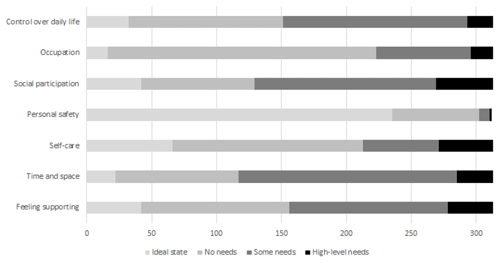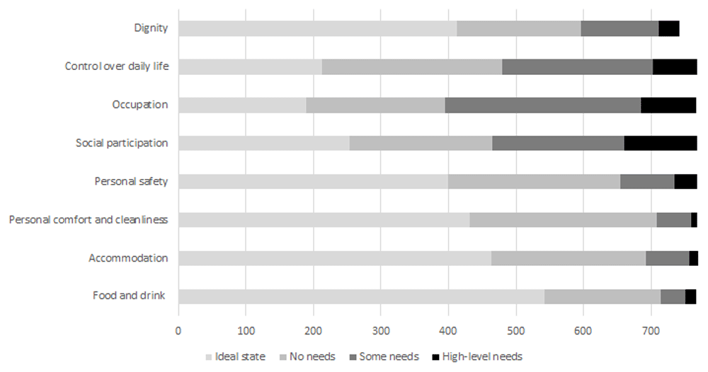 The distribution of scores by item for ASCOT (IIASC, Study 1) and ASCOT-Carer (MOPED, Study 2) are shown in Figure 5 and Figure 6. The rating of high-level or some needs are highest for the three ASCOT ‘higher order’ domains of Control over daily life, Social participation and Occupation. The ideal state (best care-related QoL) was rated by over half of the sample for the basic domains of Personal comfort and cleanliness (56.1%), Accommodation (60.1%) and Food and drink (70.1%).