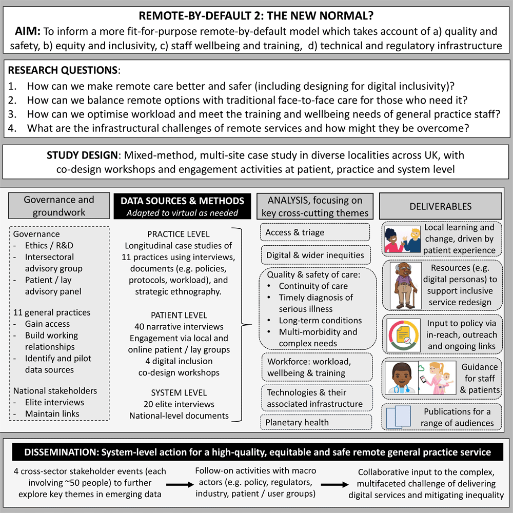 Full details of governance, NHS ethics approval and methods are reported separately2. Briefly, Remote by Default 2 is sponsored by the University of Oxford and overseen by an independent advisory group with a lay chair and patient representation. Aims, research questions and study design are summarised in Figure 1. Workstream 1 uses an embedded researcher-in-residence18 and case study methodology19 to develop multi-site longitudinal studies of general practices. Workstream 2 captures patient experiences and uses co-design with patients and staff to re-imagine service models with a focus on overcoming digital inequalities. Workstream 3 engages national-level stakeholders.