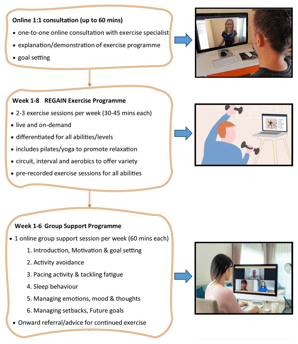 The final REGAIN online exercise and behavioural support intervention consisted of an initial 1:1 consultation with a trained practitioner, followed by eight online group exercise, and six group support, sessions delivered over eight weeks. Participants could also access an online library of on-demand exercise and support videos.