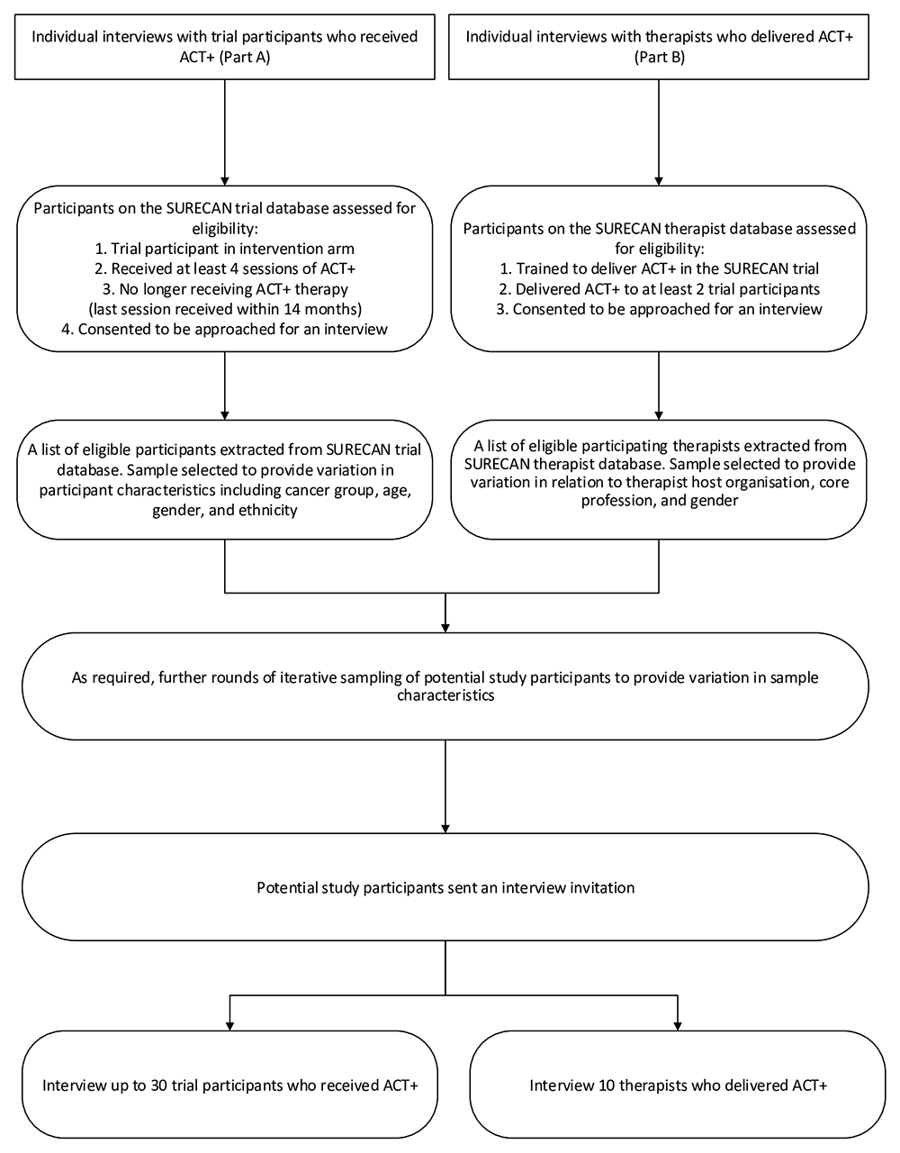 Topics for interviews with trial participants (Part A) will include the decision to take part in the SURECAN trial, expectations of the therapy, concerns about the therapy, understanding of ACT+, barriers and facilitators to ACT+, engagement in the ACT+ sessions, use of the ACT+ Participant Handbook, perceived impact of the therapy, why ACT+ worked/did not work, anything important going on at the time of ACT+, challenges emerging after completing the course of therapy.