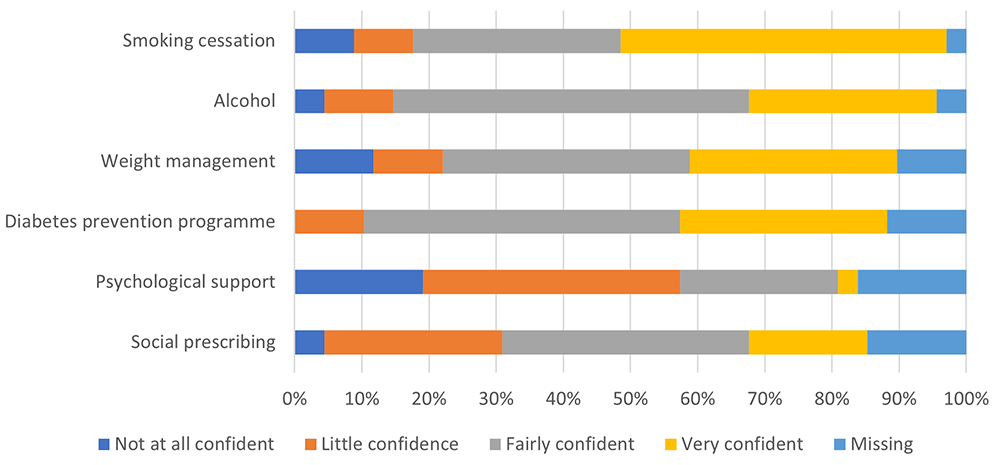 All respondents provided an overall confidence rating for the extent to which appropriate use was made by Health Check providers of the available support services. This was generally low, with over half of the respondents (n = 50; 68%) having relatively little/no confidence. Reasons for the lack of confidence varied, including lack of awareness among providers and lack of data on use of these services: