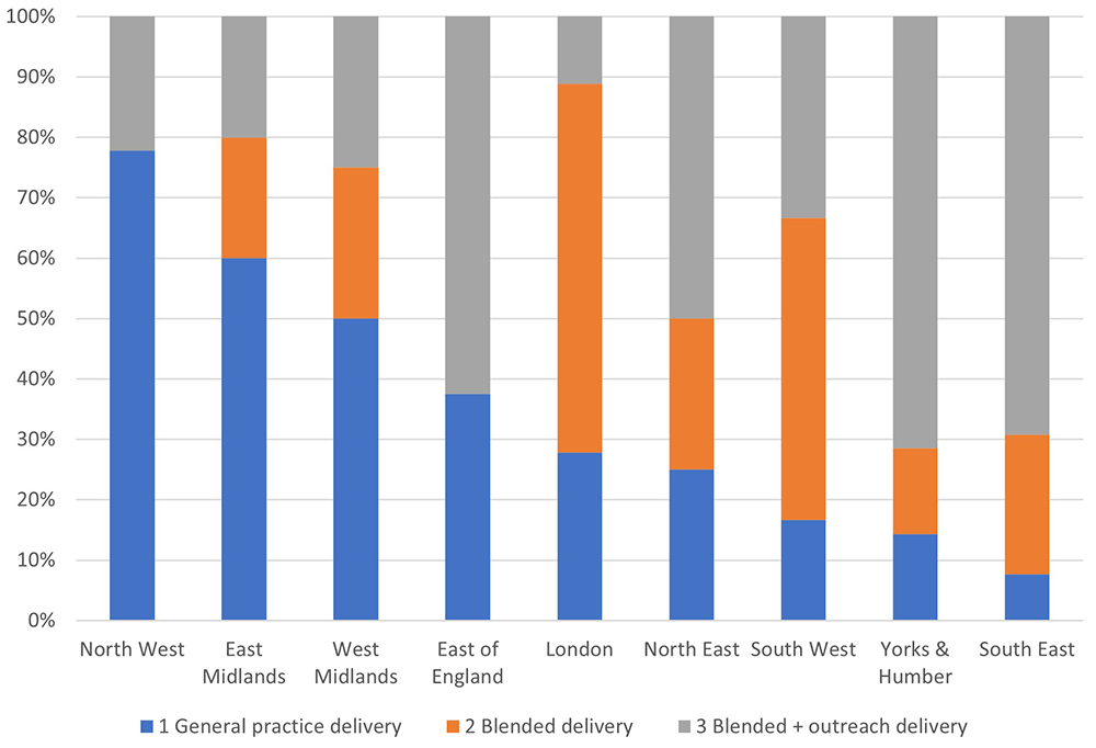 There were notable differences in the proportions of LAs in the three delivery categories in each geographical region. Whilst five out of the seven responding LAs in Yorkshire and Humber fell in the blended with outreach category, seven out of the nine responding LAs in the North West fell in the general practice delivery category (Figure 3).