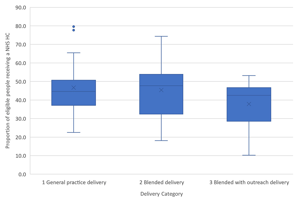 There were also no significant differences in the relative size of the public health budgets of LAs, or in the relative deprivation of LAs falling in each delivery category. However, with regards to Health Check programme delivery performance, LAs delivering Checks using a blended with outreach model achieved, on average, a lower coverage (37.8%) than those delivering using a general practice (46.7%) or blended (45.4%) delivery model (F = 3.217; p = 0.046) (Figure 4).