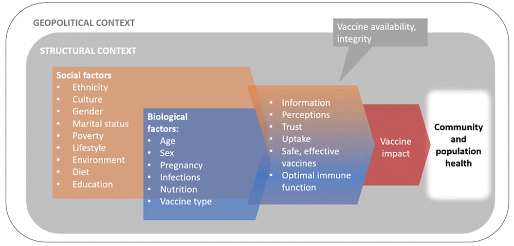 Health is intertwined with situations in which people are born, grow up, work and age: situations that are shaped by structural inequities in power and resources. Discriminatory or inequitable policies and practices that do not take into account the impact of the prevailing context on socially constructed categories such as gender and ethnicity, influencing the ability of individuals and communities to access adequate nutrition, water and sanitation, shaping exposure to pathogenic and non-pathogenic organisms. Socially, the response to vaccination campaigns reveals hesitancy, increasingly influenced by rumours, mis- or dis-information and distrust of authorities, mediated and amplified by social and conventional media, compounding impediments to vaccine access and uptake already prevalent in vulnerable settings19. Nutritional status and infection exposure interact with an individual’s biological characteristics (e.g., genetics, age) influencing their immunological and overall health status. The experiences of humans cannot be understood by prioritising a single characteristic over another or conceptualised as additive binary factors14,20.