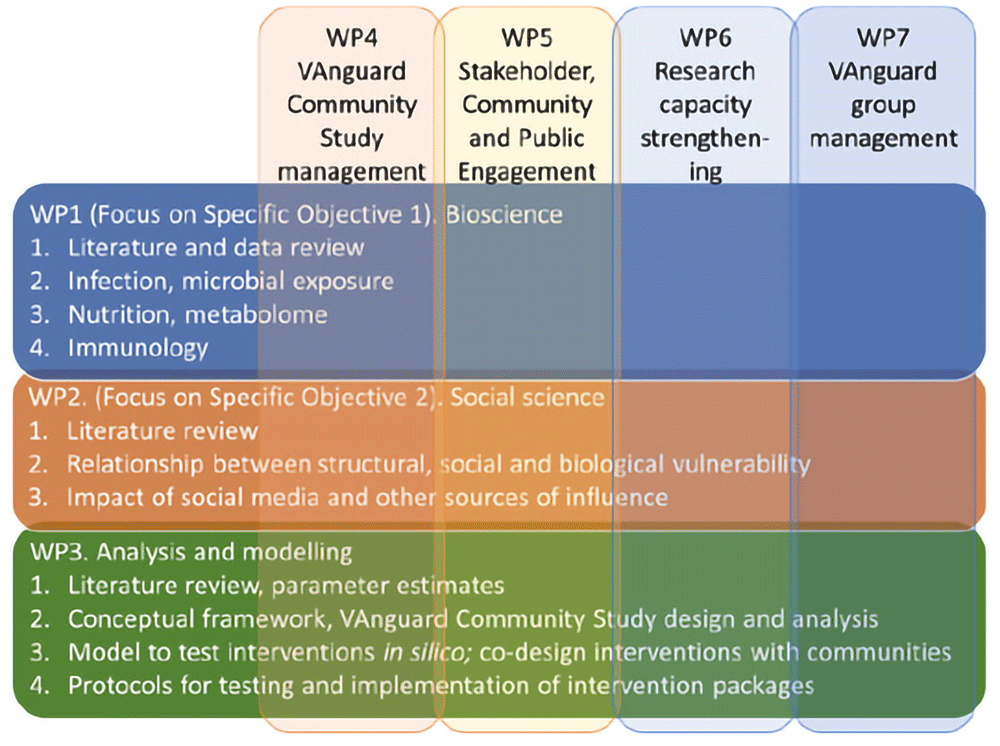 Broadly, the work will comprise a preparatory phase (year 1), a VAnguard Community Study (WP4, year 2) and an analytic and intervention co-development phase (years 3 and 4). Stakeholder and community engagement will be fully integrated throughout the research cycle. During the preparatory phase, concurrent activities will be undertaken by multiple WPs. Work will be done with stakeholders (Ministries of Health, immunisation programme partners, communities) to purposely select Ugandan and Kenyan communities that are vulnerable with regard to vaccine impact (based on vaccine coverage, and on hypothesised structural, social and biological barriers to effective immunisation) and less vulnerable communities for comparison. At the same time, we shall review the literature; and undertake analyses of data and samples from previous studies to identify biological mechanisms of impaired vaccine response. The resulting information will be shared at a consultative meeting to co-design the protocol for a multidisciplinary VAnguard Community Study with up to eight communities in Uganda and Kenya (year 2, WP4). In each community, local stakeholders and community members will be worked with closely. Results from WP1, 2 and 4 will be analysed and synthesised into a modelling framework (WP3) to co-design intervention packages for testing in further trials.
