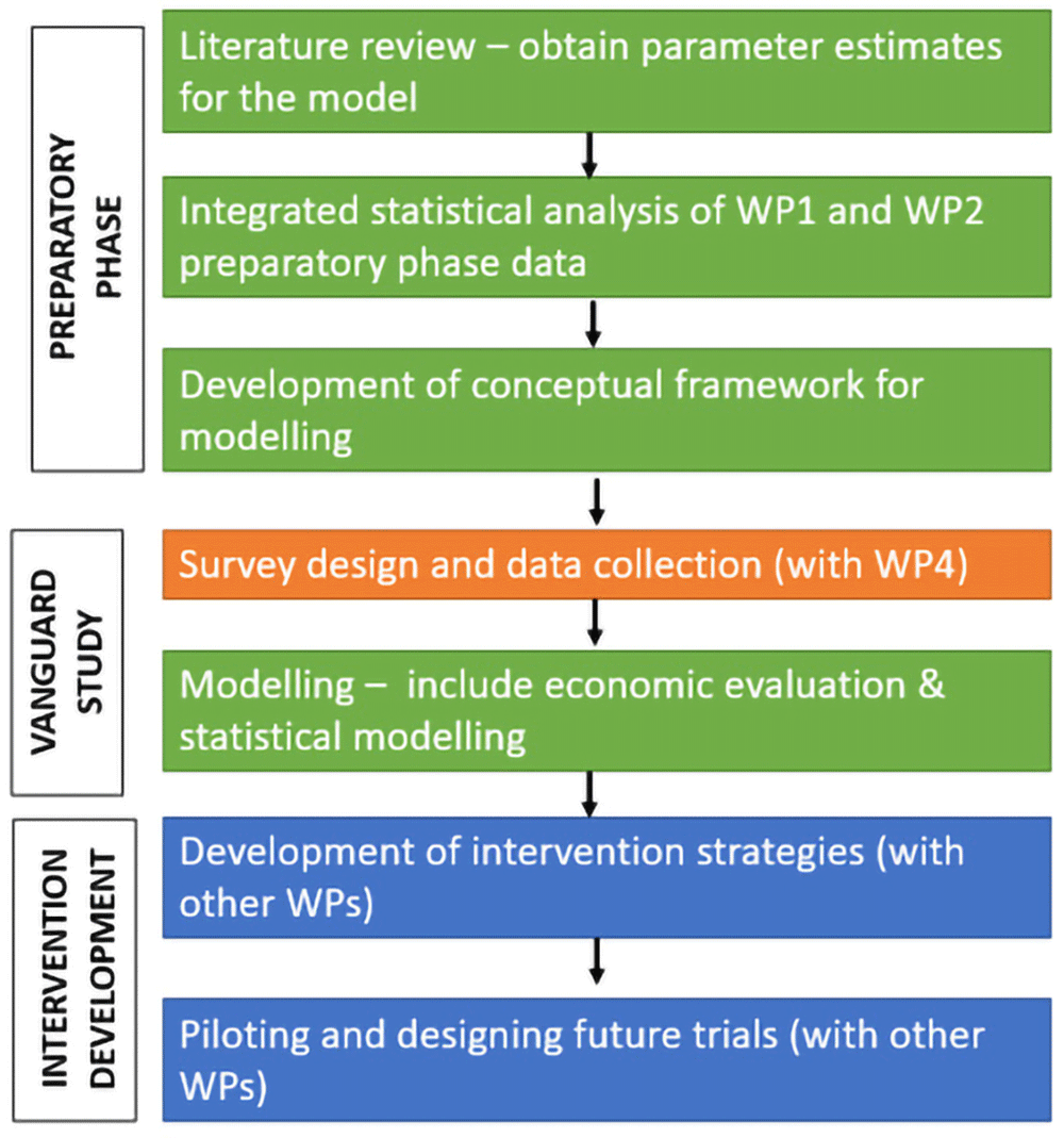 In the preparatory phase (year 1), a framework will be designed to enable data from different sources to be integrated into a coherent pathway. In this design phase, the WP3 team will participate in the literature reviews led by WP1 and WP2 which will inform parameter estimates for the model, such as disease burden and economic costs. In addition, WP3 will work with WP1 and WP2 on analyses from their initial studies, to support the design of the framework. The draft framework will guide the development of VAnguard Community Study (WP4) data collection tools, identifying areas of focus for questionnaires and sampling, and information required for economic analyses (WP4).