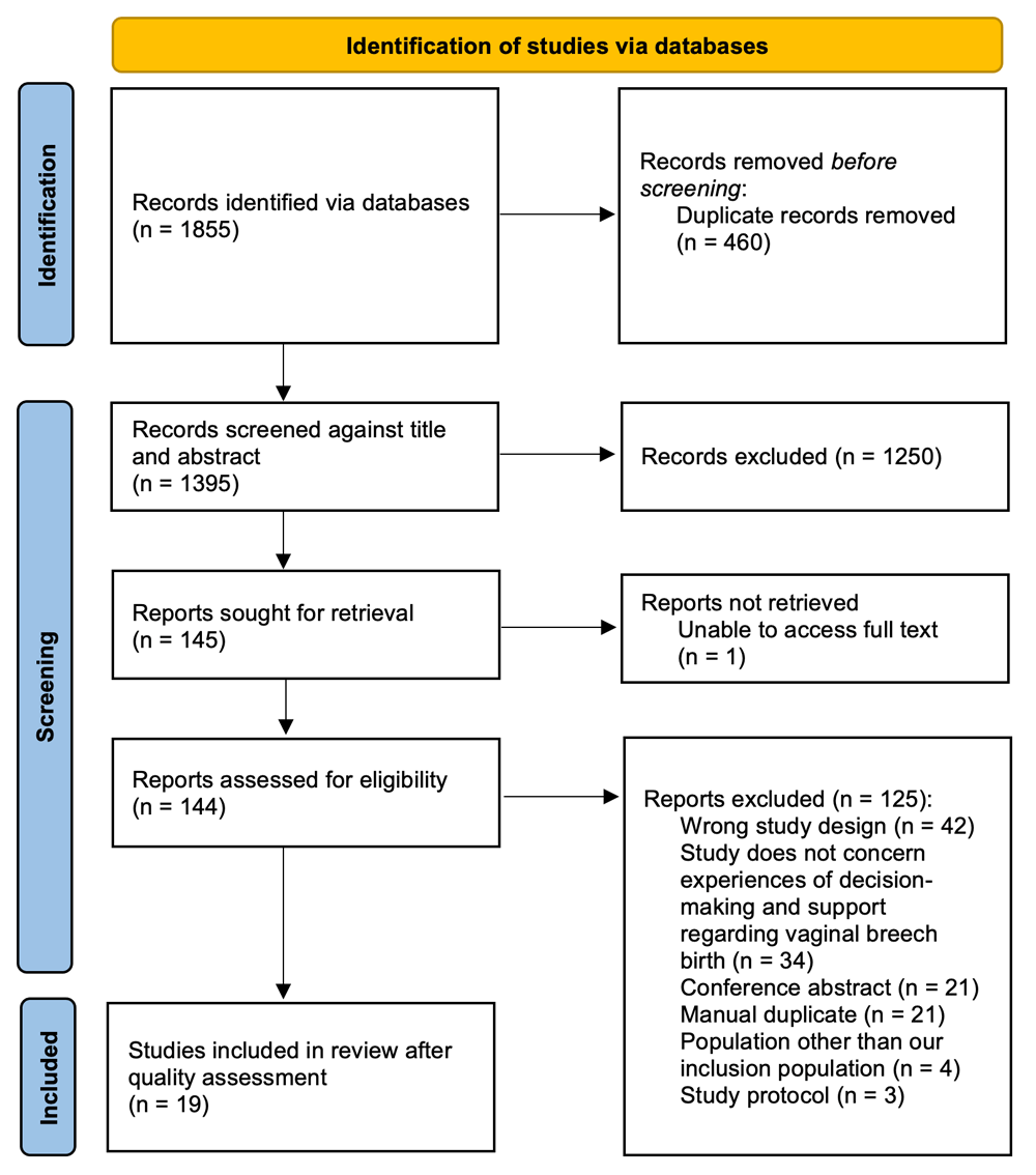 The protocol was developed and registered on PROSPERO (reg. no. CRD42021262380). The review included literature about women pregnant with a breech-presenting fetus, who sought a planned or unplanned VBB, published between January 2000 and February 2022. Studies considering only experiences of alternative management, such as caesarean birth or external cephalic version, and those investigating healthcare workers’ experiences were excluded. Table 1 summarises the review’s Eligibility Criteria.