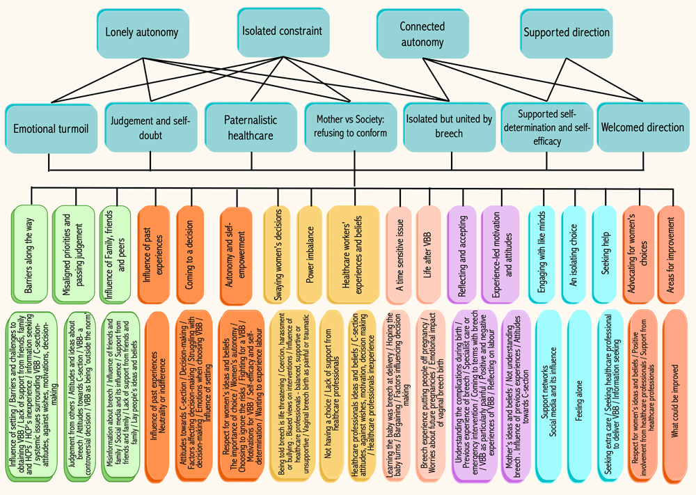 We agreed that, overall, women who wanted to plan a vaginal breech birth felt vulnerable. They wanted to connect to confident, capable healthcare providers who could help them achieve a vaginal birth as safely as possible: ‘connected autonomy.’ But their actual experiences ranged widely, including: paternalistic healthcare; emotional turmoil; judgement and self-doubt; mother vs society: refusing to conform; isolated but united by breech; welcomed direction; and supported self-determination and self-efficacy.