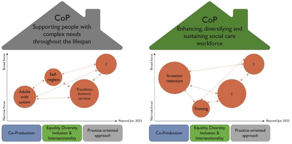 After the second networking event, an ordering and thematising process took place to take on board feedback from attendees to help identify potential issues for the COPs. The recorded discussions and responses from the second breakout session were organised into themes and helped to define the key issues of concern or domains for the COPs. The themes were arranged under two broad ‘rooves’ of the community (house) as shown in Figure 3 and were titled: (a) Supporting people with complex needs throughout the lifespan (shortened to ‘Complex Needs’), and (b) Enhancing, diversifying and sustaining the social care workforce (shortened to ‘Workforce’). An inductive-deductive approached was used in the thematising process22. Three shared principles were identified as ‘foundation stones’ for each COP: Co-Production; Equality, Diversity, Inclusion and Intersectionality, and Practice-Oriented Approach, which were underpinning themes that were identified from the initial ordering and thematising exercise and intersected across both COPs (see Figure 3).