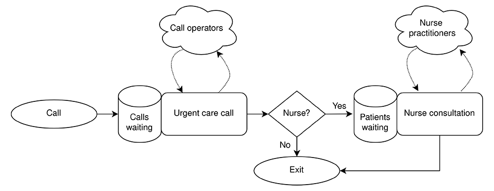 Our model is a stylised model of a typical urgent care call centre. Patient calls arrive at random to a call centre. Operators answer the calls, with a first in first out queue, triage the patient, interview following a standard script, and provide a call designation; for example, if the patient should travel to an emergency department, book an appointment in primary care with a General Practitioner (family doctor), or if a call back from a nurse is needed. If a caller needs to speak to a nurse they enter a first in first out queue until a nurse is available. Figure 1 illustrates patient flow in the model and use of resources.