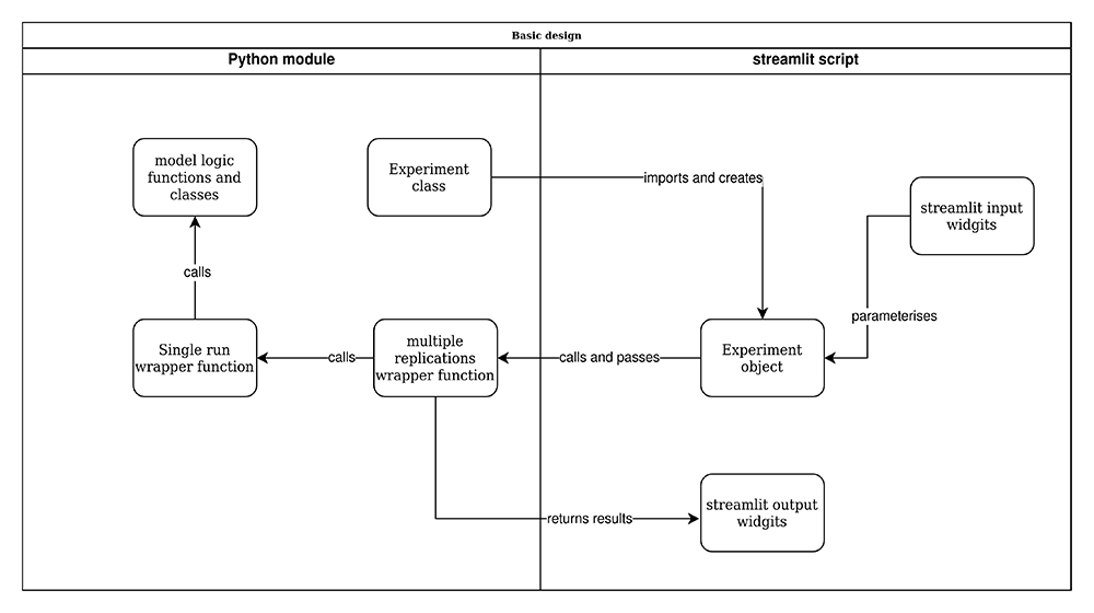 When combined with the model wrapper functions we propose in the next two sections, the simulation model becomes “swap-able”. In the language of software development, this would be called modular code. This allows researchers to easily explore different implementations of a model in different software. For example, a model may have been developed in simpy, but is re-implemented in salabim or ciw without any change to the web app itself. To a lesser degree, this also simplifies the implementation of experiments that vary the process logic within a simulation as well as quantitative parameters; for example, modelling an emergency department with and without rapid assessment and treatment protocols as patients arrive. A caveat in this second case is that depending on the process logic chosen, the web app might require additional logic to vary the parameters that are available to users.