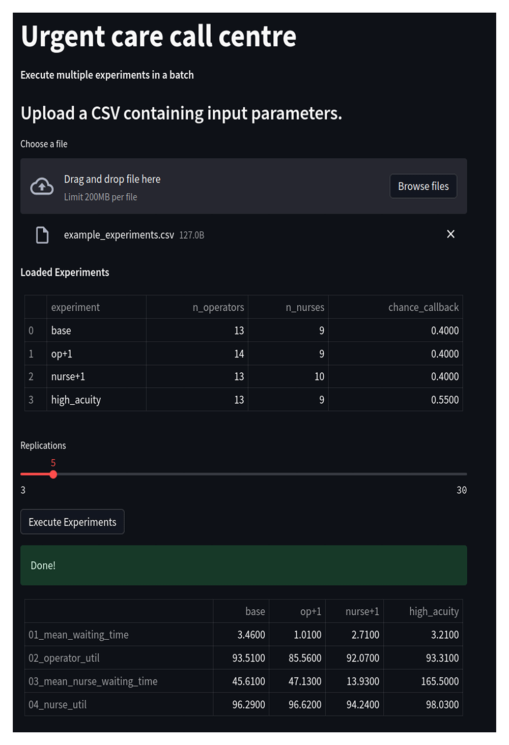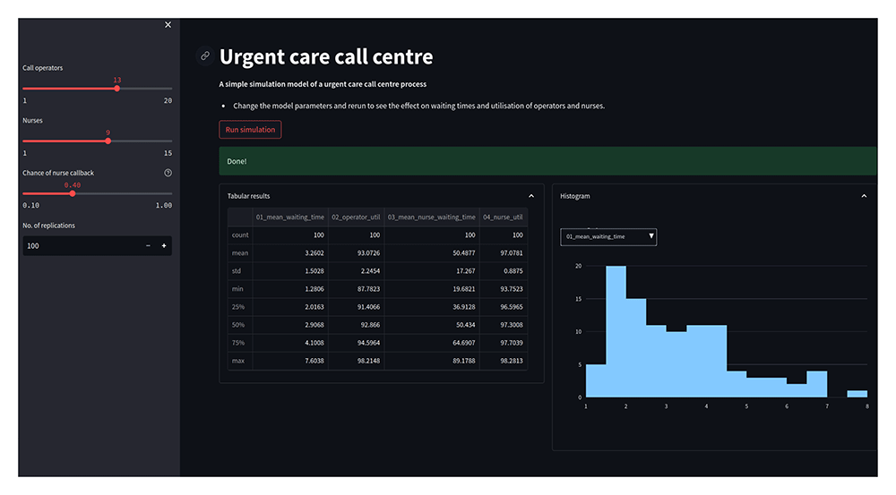 An example web app, for the urgent care call centre, is illustrated in Figure 3. An interactive version of the app is also available via Streamlit’s community cloud https://simpy-app-tutorial.streamlit.app.