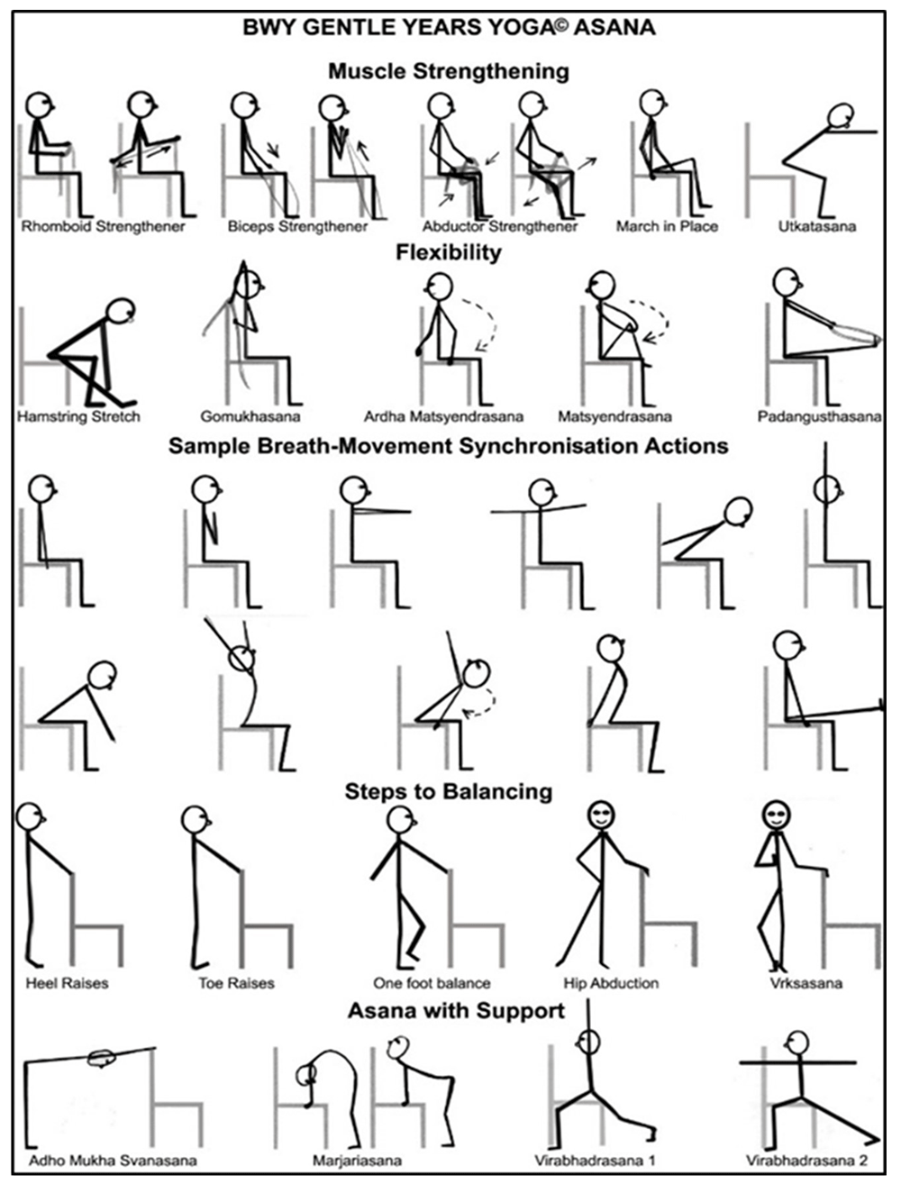 The aims of the chair-based GYY style of yoga are to improve muscle strength, flexibility, balance, mobility, and mental and social wellbeing. Chairs are used for seated exercise and for support when standing, although all the yoga content can be carried out while seated. Figure 1 shows examples of seated postures commonly used. The yoga practices are modified for the safety of individuals with varying medical conditions and functional abilities. Prior to online courses commencing, participants were sent several props (e.g., resistance bands, tennis ball, block) in an individual equipment pack to use in their classes. Preliminary one-to-one Zoom meetings were also held between to yoga teachers and their participants to discuss equipment set-up, health issues, and any course queries. Props are used to modify some of the postures and concentration activities. The physical challenge of each posture can be progressed throughout the course as participants become more able and confident. Each GYY class lasted 75 minutes and included: ‘housekeeping’ activities, five minutes; an introduction to the theme and practices of the class, basic breathing and focusing activities, five minutes; an extended warm up/mobilisation and preparatory postures, 30–35 minutes; focused postures and restorative activities, 10–15 minutes; breathing exercises, 5–10 minutes; and relaxation and concentration activities, 5–10 minutes. These activities were followed by optional after-class social time for 15–30 minutes.