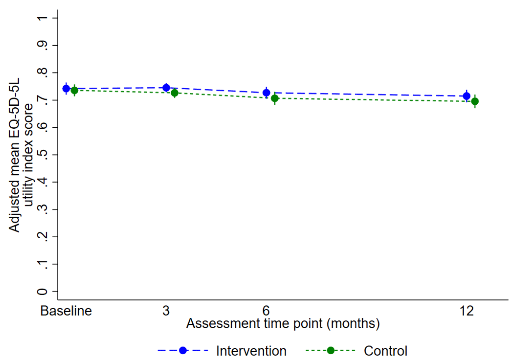 Complete EQ-5D-5L, resource use and cost data were available for 192 (42%) participants overall, though the EQ-5D-5L had high completion rates (>83%) at all time points. Differences in resource use between the groups were small in general (extended data20), though on average, higher levels of community-based care provided via GP clinics tended to be reported for the intervention group, with the exception of nursing-based care. The community service most frequently used by both groups was phone-based GP consultations followed by clinic-based nurse and GP visits. In terms of hospital-based services, intervention participants had, on average, fewer hospital-based physiotherapy visits, outpatient visits, inpatient nights in hospital, and accident and emergency visits resulting in an inpatient stay. Conversely, there were more day case hospital visits and hospital-based mental health services attendances for intervention versus control participants, on average.