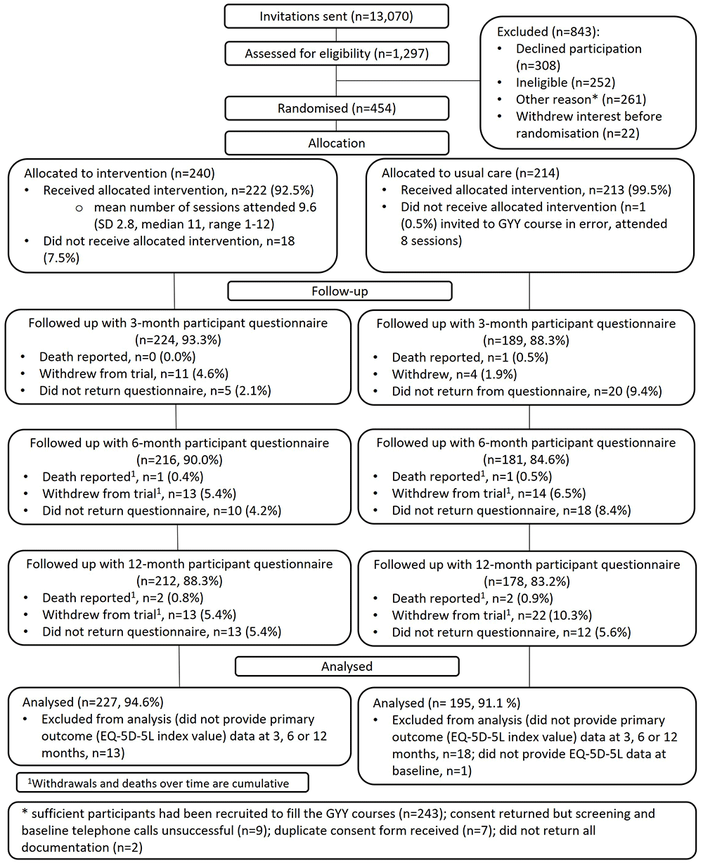 Between October 2019 and October 2021, 454 participants were randomly assigned to the intervention (n=240) and control (n=214) groups. Seven GYY courses were delivered face-to-face and 12 courses were delivered online. The mean number of classes attended among all intervention participants was nine (SD 4, median 10). In our intention-to-treat analysis (n=422), there was no statistically significant difference between trial groups in the primary outcome of HRQOL (adjusted difference in mean EQ-5D-5L = 0.020 [favouring intervention]; 95% CI -0.006 to 0.045, p=0.14). There were also no statistically significant differences in key secondary outcomes. No serious, related adverse events were reported. The incremental cost-effectiveness ratio was £4,546 per quality-adjusted life-year (QALY) and the intervention had a 79% probability of being cost-effective at a willingness-to-pay threshold of £20,000 per QALY.