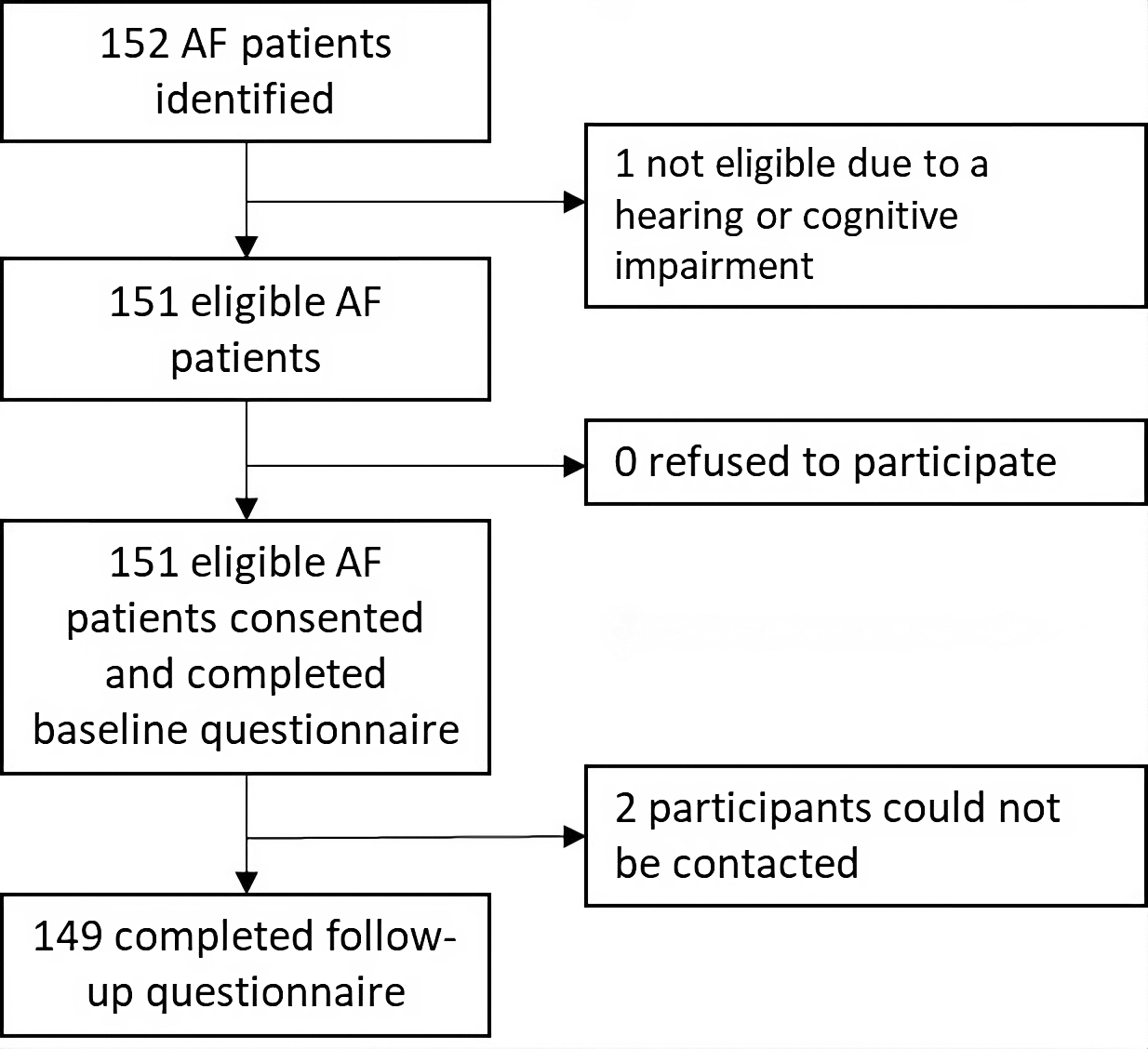 A total of 152 patients with AF were identified from the A&E and outpatients clinics located at the Jaffna Teaching Hospital ( Figure 1). One patient was excluded due to a hearing impairment, though the remaining 151 patients provided consent and were included in the study. Of these, 119 were recruited from the anticoagulation clinic, 30 from the medical clinics and two from the A&E. None of the participants were receiving first-time AF care. Two participants were lost following baseline data collection. Thus, 149 participants completed the follow-up questionnaire. Among them, 144 were followed up in person and five were followed up by phone. The median age of the participants was 57 years old (IQR=49–67) and the majority of participants were female (70%), married (62%), literate (97%), had completed primary or secondary school (81%) and identified as Sri Lankan Tamil (97%) ( Table 1). On average, participants were diagnosed with AF 13 years prior to data collection (mean=156.7 months, SD=104.2; median=159 months, IQR=80–280) ( Table 2).