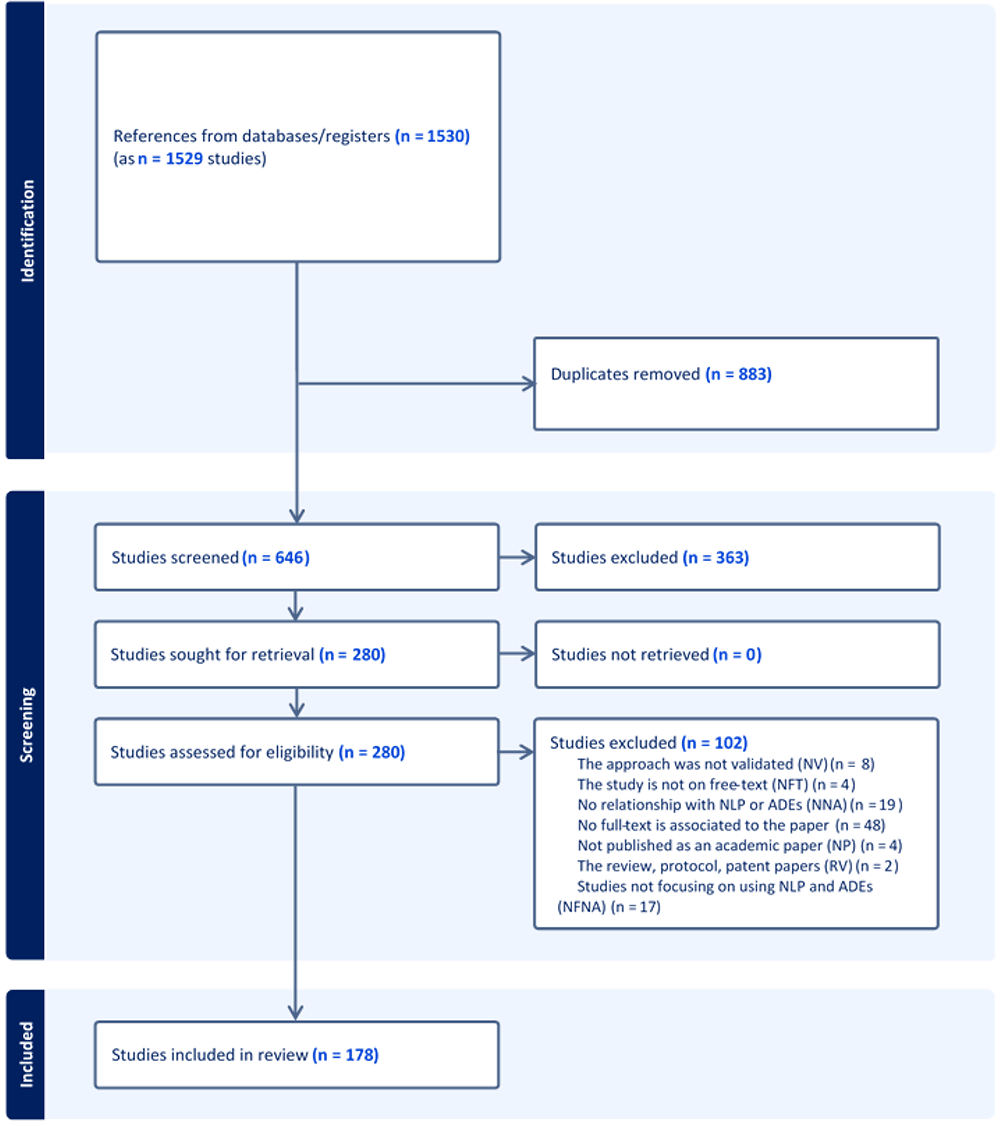 Studies were deemed eligible for inclusion if they presented and validated solutions specifically aimed at identifying Adverse Drug Events (ADEs) through Natural Language Processing (NLP) techniques, and if these studies were published in academic publications. We were also interested in the datasets related to each study. They are crucial for training models, hence recording any lexicons or corpora that are freely available is an important added value of this systematic review. The training phase for machine learning methods requires an annotated dataset. For preparing such annotated datasets, the first step is to prepare an annotation guideline supporting the annotators’ task of understanding what needs to be annotated and resolving all ambiguities. Hence, we are also interested in papers presenting and discussing annotation guidelines. However, we excluded reviews, protocols patent papers and any papers that were not published via peer review. We also excluded papers that were not in English or those that were not reporting ADEs related to human subjects. We also excluded papers that had no relationship with NLP or ADEs and those proposing approaches that were not validated or those that were not focused on free text.