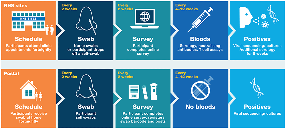 Participants in the postal pathway were asked to complete their fortnightly questionnaire on the same date as the swab and provided their barcode number for additional linkage.
