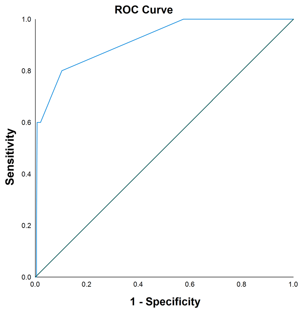To assess further the power that frequency of emergency hospital attendances predicts post-operative blood transfusion, a receiver operating characteristic (ROC) curve was drawn. The area under the curve (AUC) represents the model's ability to distinguish between outcomes: the closer the AUC is to 1, the more accurately the model correctly classifies the outcomes based on its sensitivity and specificity.