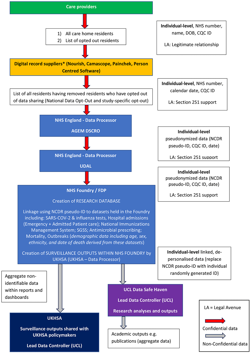 Diagram illustrating flow of data from providers to the study dataset. Red arrows represent confidential data and grey arrows demonstrate movement of non-confidential idea that has been pseudonymised / de-personalised. Research database will be created in secure data platform such as NHS Foundry or the Federated Data Platform (FDP). AGEM Arden & GEM; UDAL Unified Data Access Layer; SGSS Second Generation Surveillance System; UKHSA UK Health Security Agency; CQC Care Quality Commission; NHS National Health Service; UCL University College London; NHSE FDP Federated Data Platform. *Data sharing following approval from the relevant care provider.
