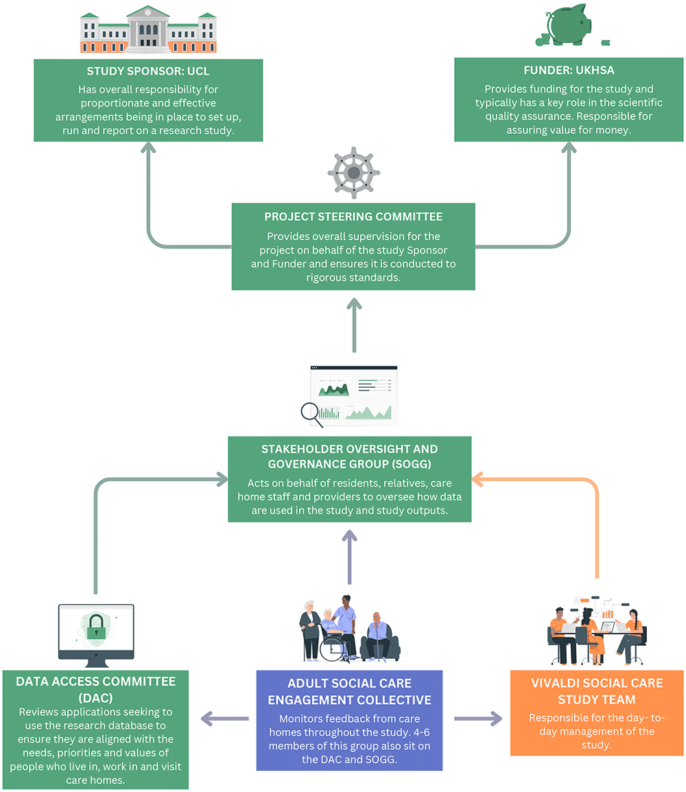 Oversight for the study is outlined in Figure 2. The project Steering Committee will provide oversight of the study on behalf of the Sponsor (UCL) and Funder (UKHSA) and will be chaired by an experienced academic in social care policy who is not involved in study management. The Stakeholder Oversight and Governance Group will act on behalf of residents and families to oversee how data are used in the study and study outputs. This group will include representation from residents, relatives, staff, and providers and experts in information governance from care providers, UCL, UKHSA, and NHSE. It will meet two to three times per year. It will provide reassurance to care providers, residents, relatives, and staff that they maintain control of how their data will be used in the project and is a critical part of building trust between care home stakeholders and UKHSA to enable future studies and continued data sharing.
