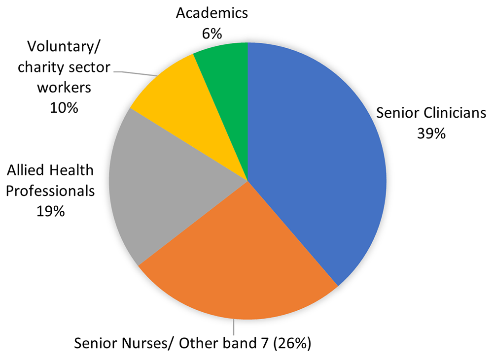 The stakeholder group consisted of 31 attendees, 12 (39%) of whom were senior clinicians (10 doctors and 2 consultant nurses; Figure 2). There were also senior nurses (26%), allied health professionals (19%), voluntary sector workers (10%) and academics (6%) (Figure 2).