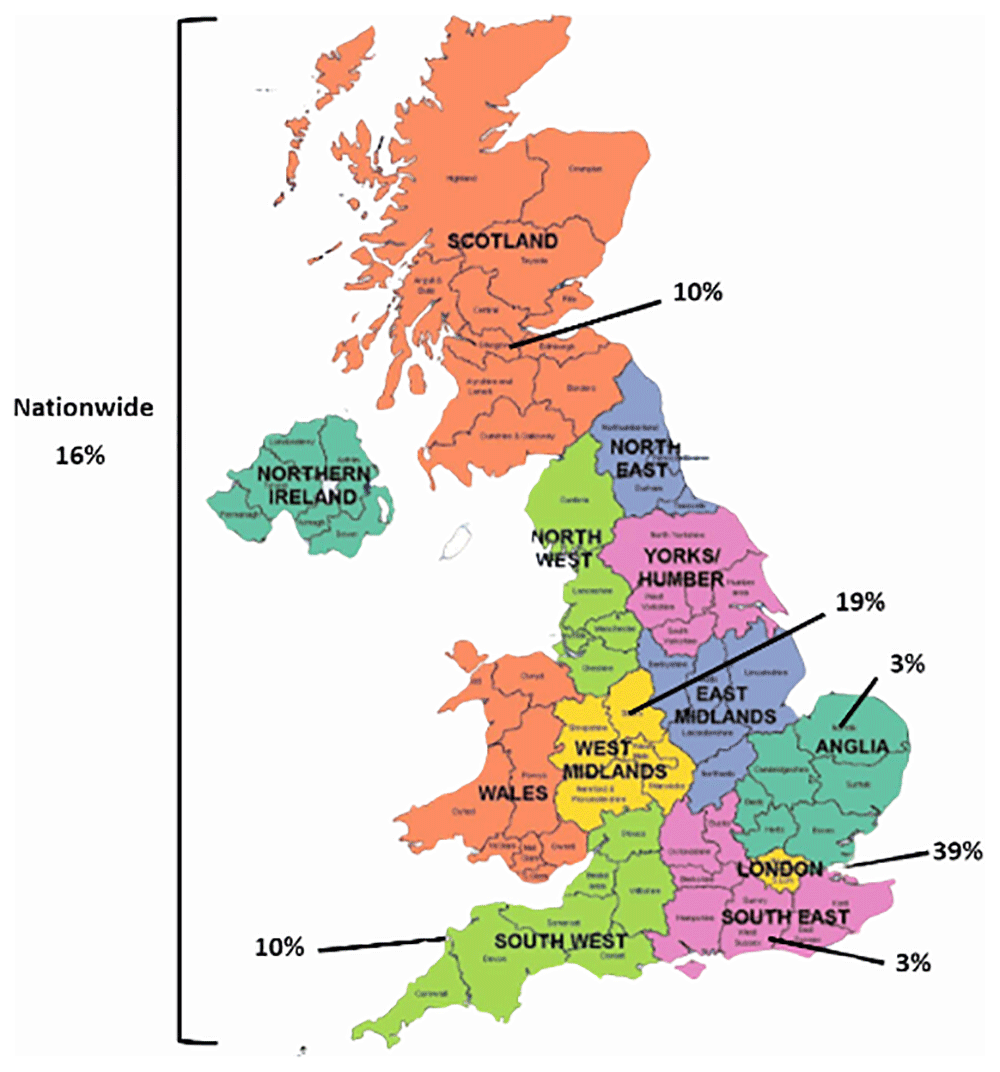 Nearly 40% of attendees were from institutions based in London. West Midlands had the second biggest representation accounting for 19% of institutions, followed by nationwide representation (16%). Scotland and the Southwest accounted for 10% each, while the East and Southeast accounted for 3% each (Figure 3).