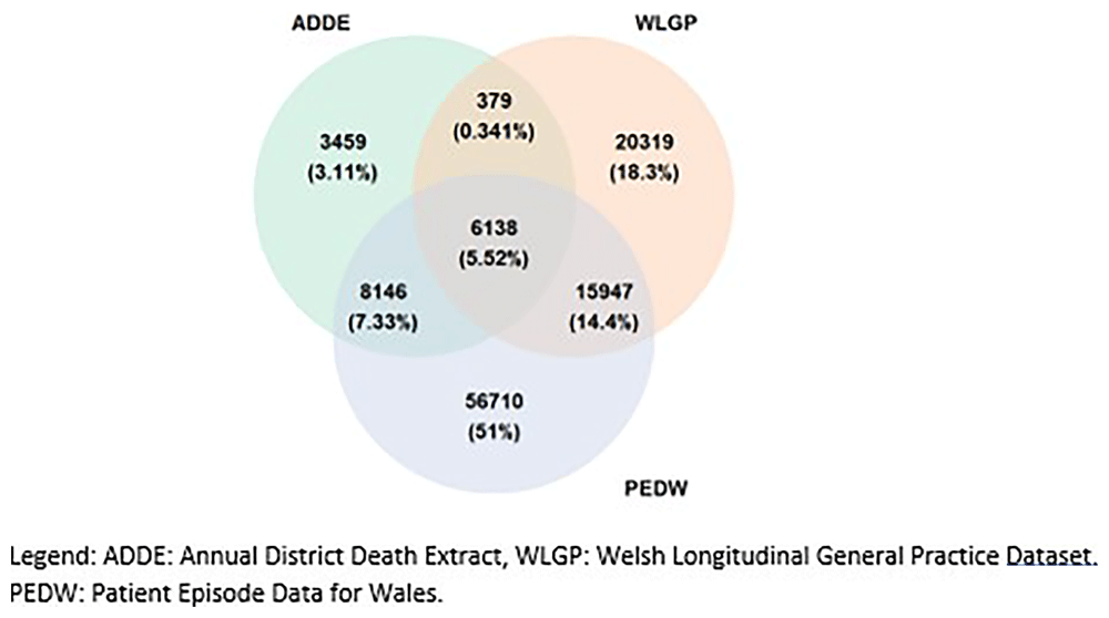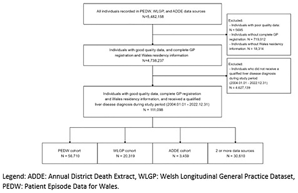In this population-based observational study, individuals diagnosed with liver disease during our study period (01/01/2004 to 31/12/2022) were identified using the Secure Anonymized Information Linkage (SAIL) Databank, which incorporates Welsh Longitudinal General Practice (WLGP) primary care data, Patient Episode Database for Wales (PEDW) secondary care data, and Annual District Death Extract (ADDE) from the Office for National Statistics (ONS) mortality data. The SAIL Databank is one of the richest anonymized individual-level, population-scale trusted research environments (TRE) in the world, containing a variety of health and social care, administrative, geo-environmental, and specialist data sources (saildatabank.com Ford et al., 2009, Rodgers et al., 2012). SAIL contains 86% primary care and 100% secondary care data for all Welsh residents and those receiving NHS Wales services. The wealth of information available in the SAIL Databank includes lifestyle and clinical data (alcohol excess, BMI, injecting drug use, smoking, and diabetes), prescribing data, clinical results extracted directly from laboratory reporting systems (e.g., abnormal liver function tests and thrombocytopenia), and environmental and socio-economic deprivation data. ICD-10 codes were mapped to read codes to capture primary SAIL with secondary care diagnoses of liver disease. Liver disease diagnoses were drawn from three 3 sources; secondary care (PEDW), primary care (WLGP), and death certification (ADDE). The overlap between these three sources is displayed in a Venn diagram (Figure 1). Discrete prediagnosis stages of liver risk factors, alcohol consumption, obesity, and metabolic syndrome diagnoses were defined to enable assessment of the progression of liver disease in a further extension of the Liver Disease Registry methodology.