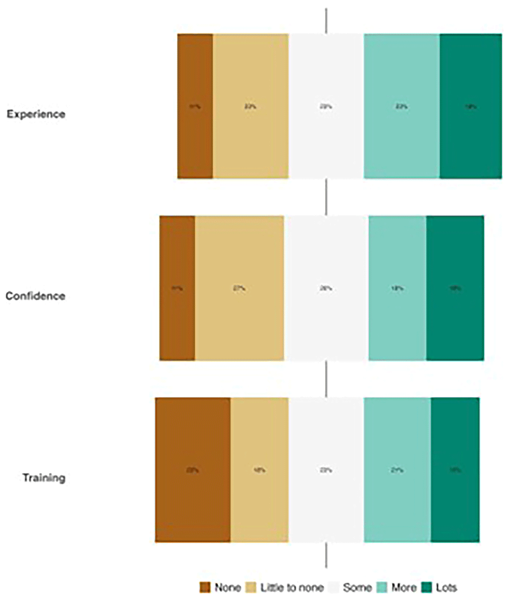 Training, education and experience. Seventy-five respondents completed an online survey to report their experience of medical research. This included 28 nurses, doctors and 12 additional workers. There was a marked spread of experience, confidence and training in research (Figure 1). Overall a minority of respondents (43%) reported some or lots of experience of research, 27% reported being fairly confident or very confident doing research and 27% of respondents reported receiving some or lots of research training (Figure 1).