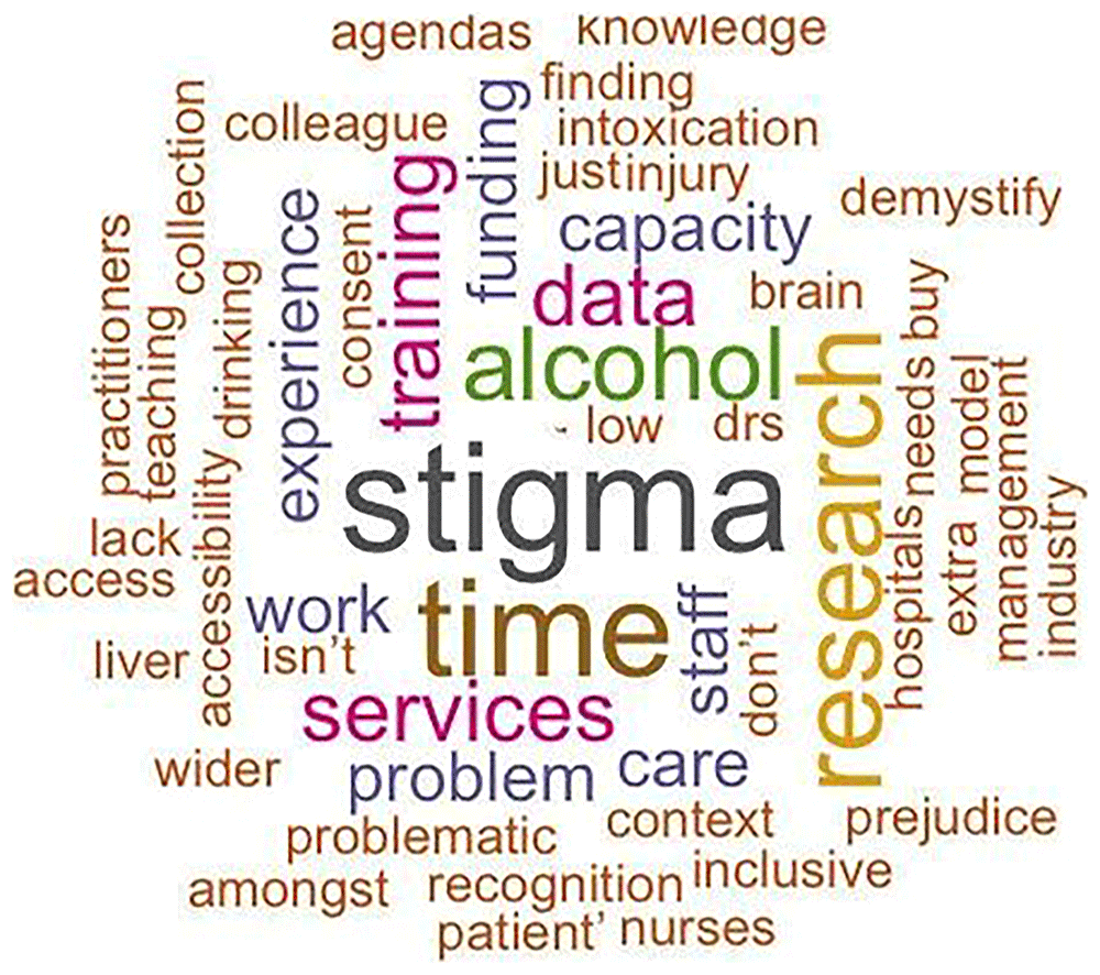 Perceived barriers to research. Face to face meetings were held across the north of England (in Manchester, Middlesbrough and Leeds) and online. At each meeting attendees considered current barriers to research in alcohol related liver disease. Common barriers identified were stigma around ArLD, a lack of practitioners’ time for research, and a lack of training and experience (Figure 2). Sorting these barriers into themes showed that practical problems, in particular time, were the biggest barriers to research in ArLD, as well as stigma, training and funding. Further to this, in collaboration with another NIHR funded research partnership (ALPINE) we undertook another survey of the medical workforce in gastroenterology or hepatology to explore current time available for research. Of twenty respondents, 8 reported that they had protected research time in their job plan but overall the average time available for research was low - a median of 1 session per week and there was scepticism that doing research was feasible with current arrangements: only 6 of the respondents considered that research was feasible with current demands on their time.