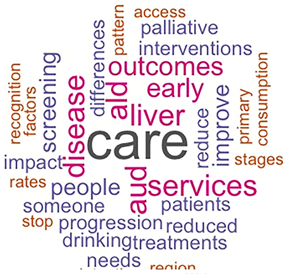The NEAT group considered future research into ALD, and the research questions that should be answered. Common themes that were considered important were broadly grouped as research into natural history (How do metabolic or psychological cofactors influence the development of ALD?), interventional (How can we prevent progression of ALD), structural (How can we improve engagement with medical services? How does the built environment influence ALD?). Further research into palliative care was considered important, and moving research into primary care or community settings was also identified as a priority. Themes for future research are summarised in Figure 3.