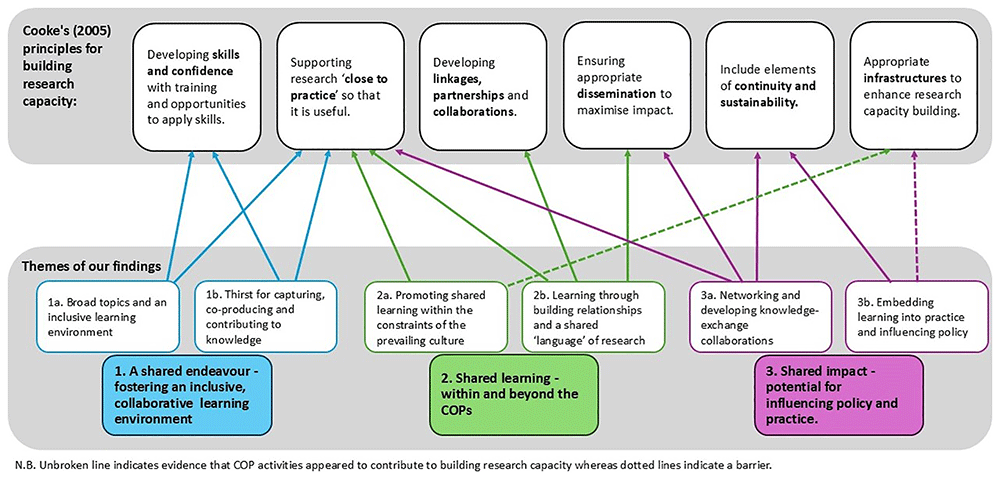Reflexive thematic analysis generated three key themes: fostering an inclusive and collaborative learning environment; enabling shared learning within and beyond the COPs; and generating shared impact through influence on policy and practice. These findings were mapped against Cooke’s (2005) framework for building research capacity.