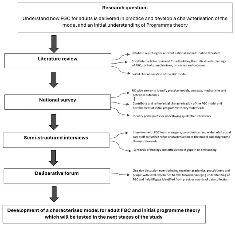 The aim of this study was to examine how FGC for adults and mental health is being delivered in the UK and, in particular, how practice model(s) may be characterised (the focus of this paper) using a realist approach (Pawson & Tilley, 2004), which may be the programme theory that underpins this (the focus of the Part 2 Paper to follow). We sought to achieve a comprehensive understanding through an integrative approach, drawing together findings from an analysis of the international literature, a national online survey, interviews with selected stakeholders, and a deliberative forum comprising a cross-section of informants from the field.