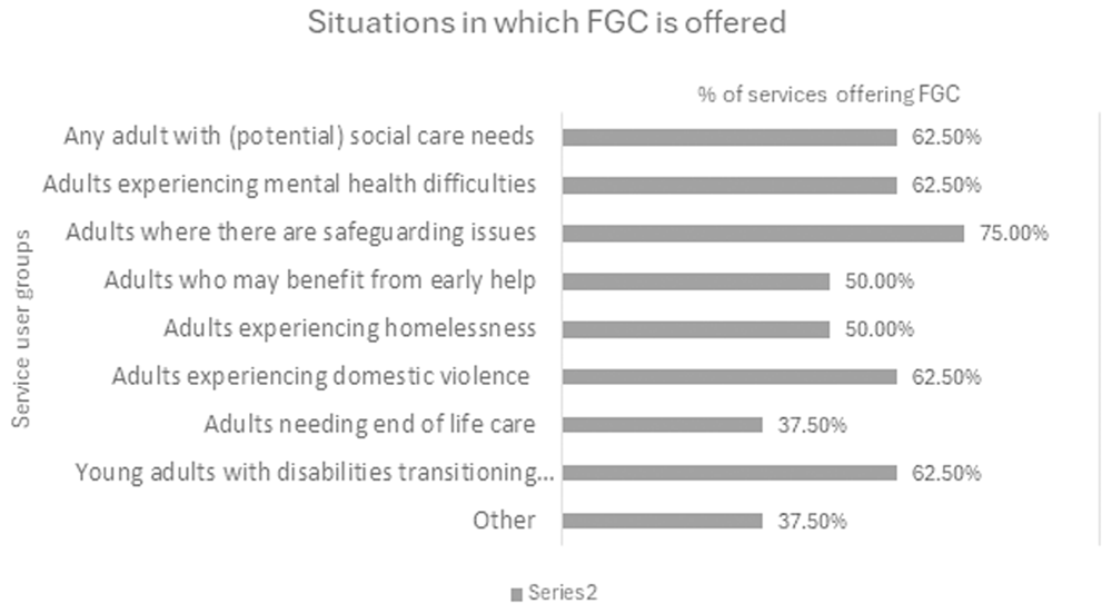 The survey was conducted between January and June 2023. To create sufficient awareness, we employed a variety of platforms, including dissemination through social media (our project website, X and LinkedIn handles), through our practice partners to share with relevant stakeholders, the Chief Social Worker (adults) and the Principal Social Workers’ Network for England, our FGC adult research and practice network group, and by directly approaching organisations that had indicated an interest in setting up an adult FGC service or had already set up one. Despite adopting an active dissemination strategy, we received a low response rate (n=7), suggesting a low level of current adult FGC activity in the UK. Following consultation with the study’s strategic advisory group, the survey was reopened for two months (May and June) to confirm that the low response rate was due to the scarcity of services offering FGC. Alongside reinstating our survey, a simple poll using Online Surveys was created to allow organisations an opportunity to share their longer-term plans regarding FGC. This was primarily conducted to gather responses from a wider pool of organisations with a potential interest in FGC to better gauge whether our low response rate was indicative of the actual level of FGC activity across the UK. The poll was circulated via the Chief Social Worker (adults), the Principal Social Workers’ Network for England, and equivalent networks in Scotland and Wales. We were informed that although there had been an initiative to trial FGCs for adults by the integrated Health and Social Care Board in Northern Ireland, no actual conferences were offered and the initiative was no longer active. Responses to this poll elicited 16 responses, all but one indicating no plans to set up an FGC service in the near future, confirming our capture of the limited extent of current FGC activity in the UK.