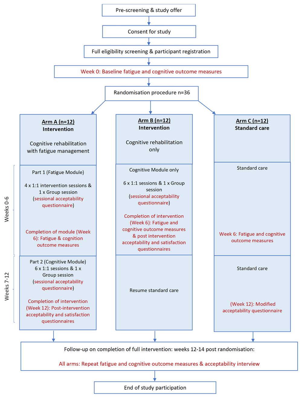 Thirty-six participants will be recruited and randomised to either 1) a 12-week block of intervention (cognitive rehabilitation with fatigue management), 2) a 6-week block of intervention (cognitive rehabilitation alone), or 3) 12 weeks of standard care. Randomisation will be undertaken centrally by the study team using GraphPad random assignment. Participants will be young people aged 7 years to 17 years, 11 months who have been diagnosed with a childhood central nervous system (CNS; brain) tumour, or received oncology treatment to the brain, and are current patients at Great Ormond Street Hospital for Children (GOSH). The study is a single-site study. All participants will be recruited at GOSH, with each participant completing a 14-week study period. All study procedures will take place at GOSH.