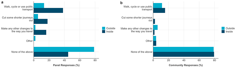 LEZ enforcement did not appear to influence whether a commuting journey included the LEZ area. Significant commute changes are more likely to occur after moving home or changing employer (Clark et al., 2016). Nevertheless, there were more changes to the nature of the commute for those traversing the LEZ compared to those who did not. Following implementation of the Madrid LEZ, there was an observed 29 percentage point decline in private vehicle use, with 9 and 8 percentage point increases in public transport and active travel, respectively (Tarriño-Ortiz et al., 2022). Our results also indicated an increase in LEZ commutes with public transport and active travel, either as a component of or for the entire journey. These results coincide with a greater proportion reporting, as a result of the LEZ, walking, cycling or using public transport for shorter journeys inside compared to outside the LEZ, at least in the panel survey. Lower observed increases in active travel in the community survey could be due to a greater number of active travel users at baseline, as observed elsewhere (Le Gouais et al., 2021). Other studies have shown increases in public transport both inside and outside of the boundary, such as for the Rotterdam LEZ (Attia et al., 2023). However, such changes are not universal and may be context-specific: the Bradford Clean Air Zone, which charges larger vehicles (e.g., buses), but not private vehicles, found an overall increase in private transport to get to work (Mebrahtu et al., 2024).