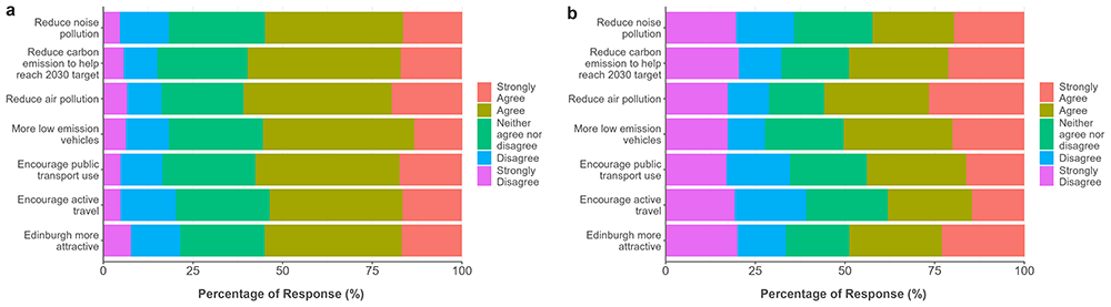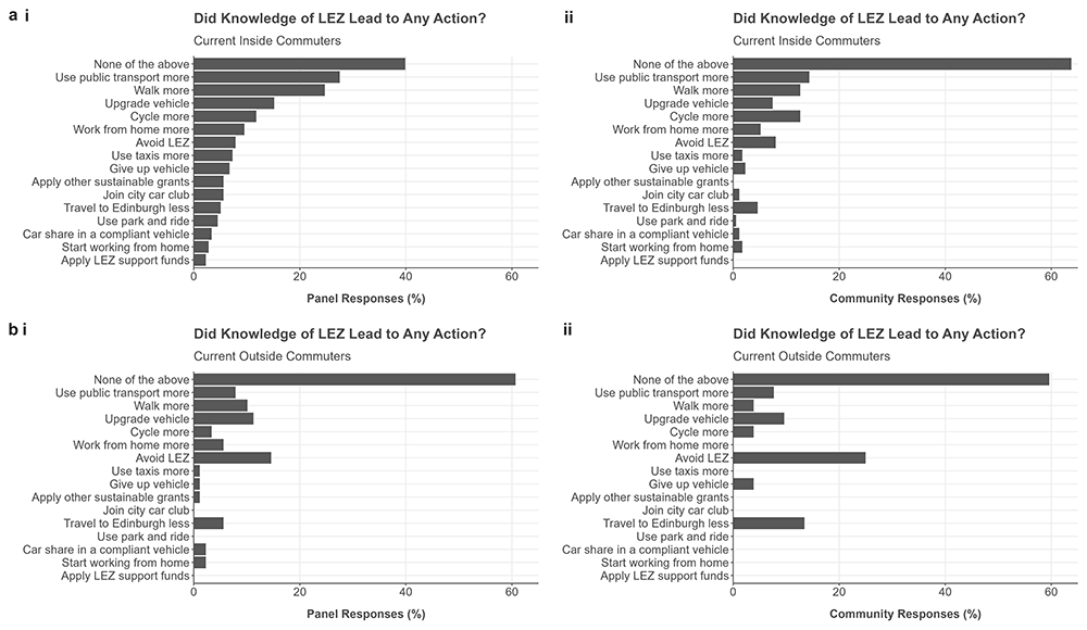 Our study has several strengths. The survey represents short-term results of the travel behaviour impacts and perspectives from commuters on the enforcement of the Edinburgh LEZ. We collected detailed information involving travel inside and outside the LEZ, and before and following enforcement using two recruitment methods. To help with understanding the impacts, we included questions on specific actions attributed to knowledge/awareness of the LEZ. Several limitations should be noted with the interpretation of our results. Our survey used a cross-sectional approach and relied on the recall of individuals of travel behaviour prior to LEZ enforcement. While self-reported travel behaviour has been shown to be reliable at the group level (Kelly et al., 2014), recall of pre-enforcement travel may have been less accurate, particularly if the start of LEZ enforcement was not a particularly salient event (Müggenburg, 2021). The use of objective data to assess traffic volumes or public transport use, for example, should be undertaken to compare with analyses based on subjective inputs (Tassinari, 2024). Travel behaviour may have differed by season between the current (i.e., October/November) and pre-enforcement (i.e., pre-June) timelines. Some respondents may have been less likely to engage in active travel during potentially cooler and darker conditions as reported in the ‘current’ time-period, the impact of which may have downplayed any positive associations following LEZ enforcement (Brainard et al., 2019). Impacts may have been underestimated, given the LEZ was implemented two years earlier (without issuing non-compliance fees); individuals may have undertaken specific changes prior to enforcement, which would not have been captured through the analysis of travel before and after enforcement. Nevertheless, we did ask about the replacement of non-compliant vehicles, which applied to a minority of respondents: four of eight individuals commuting inside the LEZ reported upgrading their non-compliant vehicle. Survey questions related to behaviour changes due to knowledge of the LEZ and agreement on potential LEZ impacts did not specify ‘enforcement’, so it was not possible to distinguish effects from implementations versus enforcement in those responses.