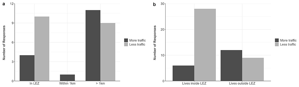 Traffic displacement. The minimum distance from the full home postcode to the nearest segment of the LEZ boundary was calculated for each respondent using the open-source software, QGIS (v3.30.0) (https://qgis.org). To examine any potential traffic displacement, taking account of the potential discrepancy between reporting of postcodes and living inside/outside the LEZ boundary, we compared two sets of respondents who reported “more traffic” or “less traffic” as a reason for any changes to frequency, duration, or mode in commute or other travel. The data for inside and outside commuters, as well as people who travel to the LEZ for other reasons, was used for this analysis.