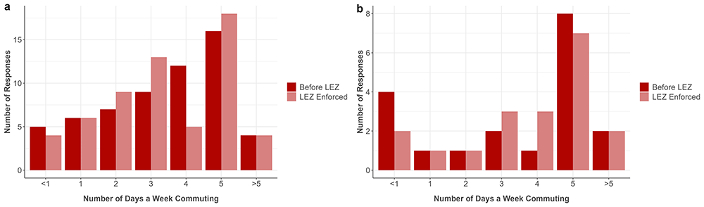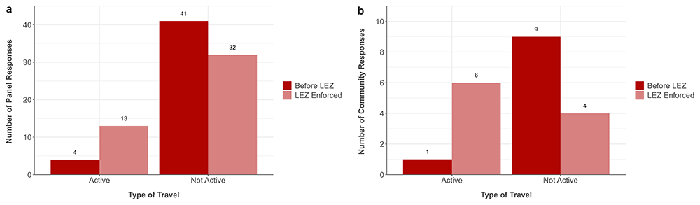 Following LEZ enforcement, there was a clear differentiation in transport mode usage, with more people using the car alone for their commute outside the LEZ and more people using public transport inside the LEZ. Few respondents changed whether they accessed the LEZ area. Nevertheless, comparing inside to outside commuters, 70 (44%) versus 8 (10%) in the panel survey, and 41 (24%) versus 4 (9%) in the community survey, respectively, reported some change in the frequency, duration, or mode of transport following enforcement. Results suggested a small, but statistically significant, shift towards active travel and public transport within the LEZ, with a decrease in private vehicle use. Panel survey respondents tended to agree more than community respondents with the potential positive impacts of the LEZ.
