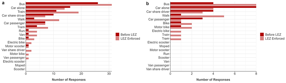 The results showed differences in how people travelled inside and outside the LEZ, as well as before and after enforcement. More people used cars outside the LEZ and used public transport inside the LEZ. Following enforcement, there was a small shift towards walking, cycling, and using public transport within the LEZ.
