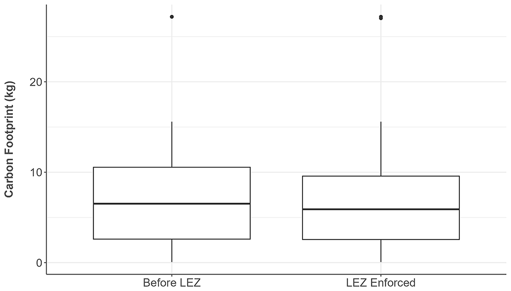 Carbon emissions. As an additional analysis, given the LEZ will contribute to Edinburgh’s 2030 Climate Strategy (CEC, 2021), we analysed the total commuting carbon emissions before and after enforcement for single modes of those commuting inside the LEZ. Emission estimates were based on reported mode, duration, and weekly frequency. As we did not have data on distance travelled, we estimated speed by mode via published sources, including the Physical Activity compendium (Hermann et al., 2024).