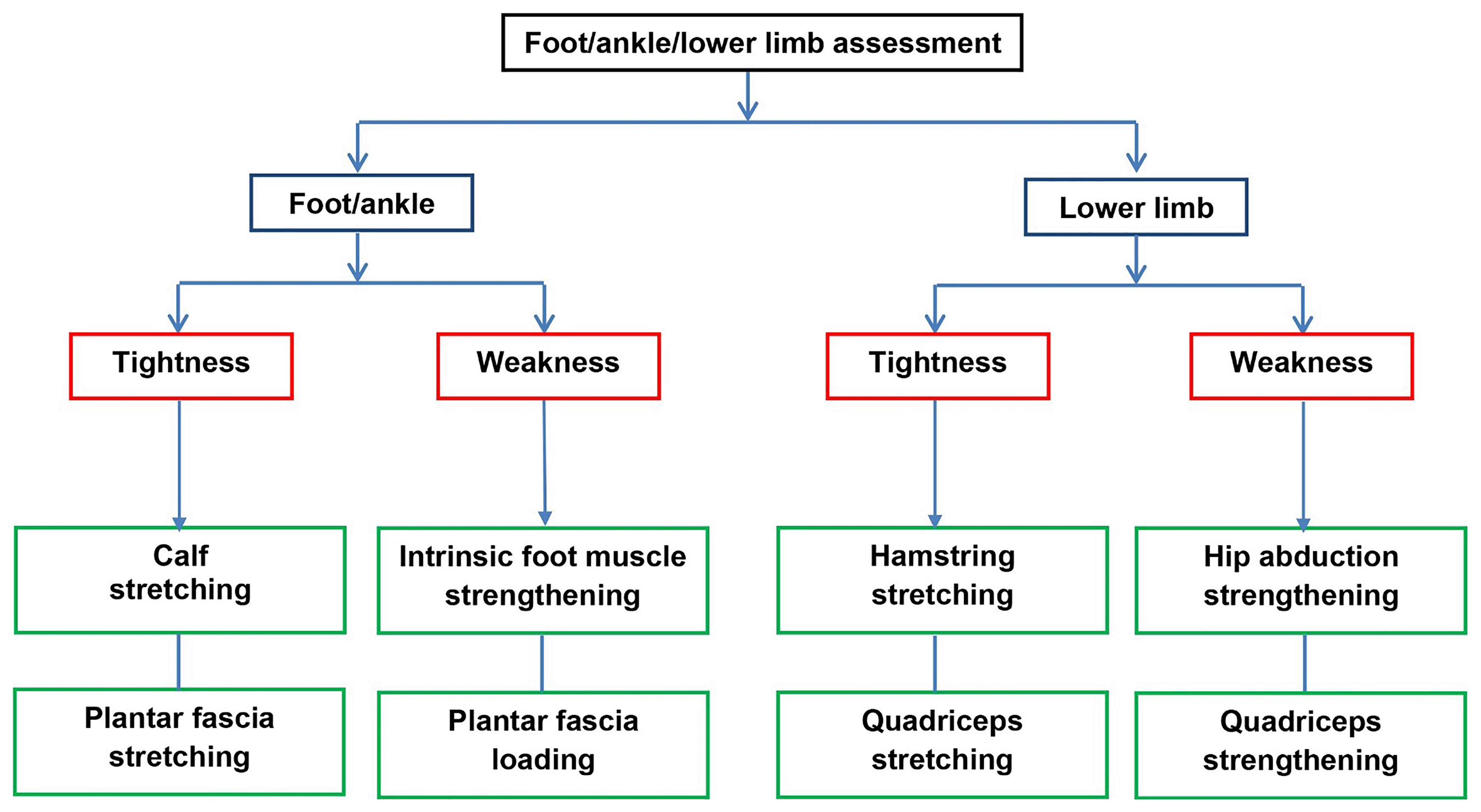 Participants randomised to SMA-exercises will be offered the SMA booklet at the initial treatment appointment. The treating physiotherapist or podiatrist will assess foot posture and function to determine the exercise type and dose. At the discretion of the clinician, a more generic lower limb assessment of alignment and function can also be undertaken, enabling strengthening and stretching for hip abductors, quadriceps and hamstrings to be prescribed if deemed to be important as part of the overall PHP treatment. Exercise selection will be informed by the level of clinically-observed muscle tightness, weakness and functional limitation (see Figure 1). Exercise dose will be individualised and progressed, based on assessment findings and informed by current exercise guidelines.46 The exercises are drawn from best available evidence5,20–22,47,48 and discussion with clinicians during workshops prior to our pilot and feasibility trial. Exercises include foot-specific stretches/exercises targeting the plantar fascia, intrinsic foot muscles, Achilles tendon, key ankle-related muscle groups such as soleus and gastrocnemius, and other muscle groups in the lower limb identified as targets within the assessment. Participants will be taught how to perform and progress these exercises and given an individualised and detailed exercise sheet (online or paper) describing the regimen and showing photographs of the exercises. The exercise sheets provided will be trial-specific exercises selected by the clinician and comprising photographs and written instruction completed by the clinician (see extended data). Participants will be offered up to 6 treatment sessions (1 initial and up to 5 follow ups) over 12 weeks at the discretion of the treating clinician (face-to-face appointments prioritised if possible, or virtual, telephone, if required).