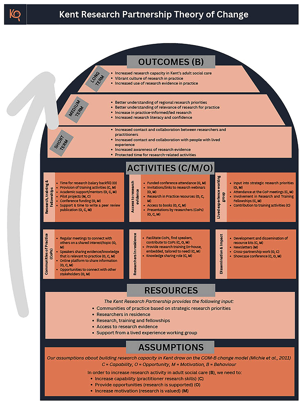 These findings provide an important foundation for the consideration of research capacity development within social care. Nonetheless, it is important to recognise some additional complexities associated with the UK context. Firstly, persistent workforce issues (Skills for Care, 2024), and a significant funding gap (Idriss et al., 2021) mean the sector in under unprecedented pressure. Secondly, social care delivery is more dispersed relative to health care, encompassing a wide range of different services, operated by independent, voluntary and statutory sectors, and including a large informal care sector. Consequently, it is essential that social care capacity building is considered and evaluated in its own context, with models taking into account these unique factors. To address this gap in knowledge, we present the Kent Research Partnership and a Theory of Change model for research capacity building in adult social care. The importance of Theory of Change development in sectors where evidence on research capacity building remains absent has been illustrated in, for example, global health research (Stewart, 2015).