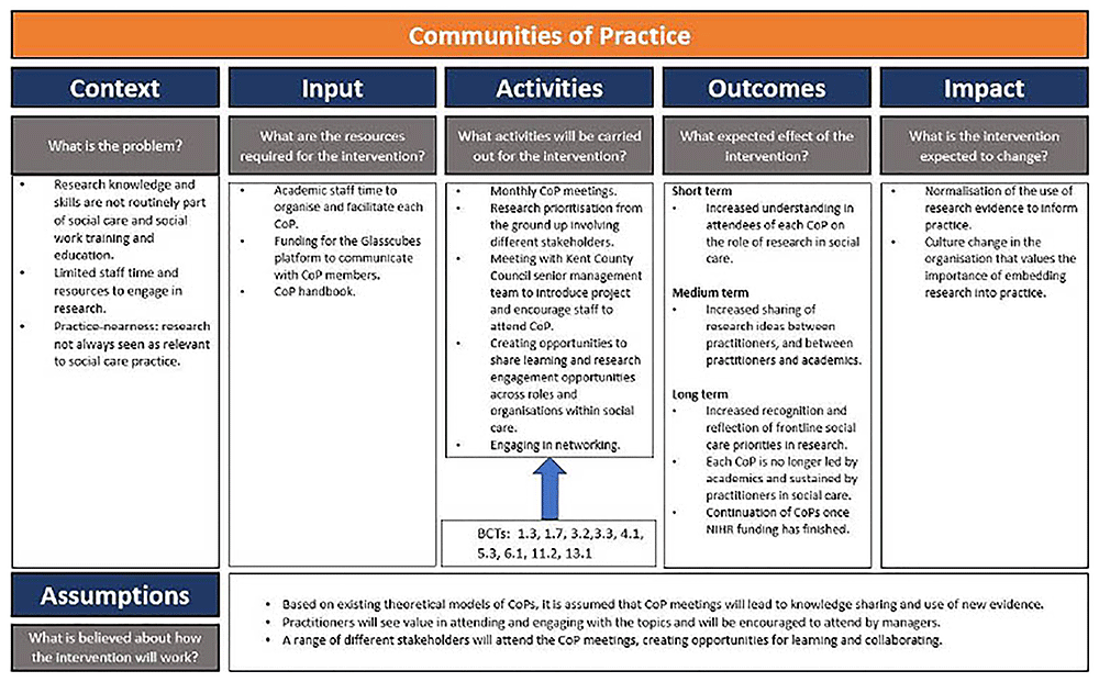 Regards influencing reflective and automatic motivation to engage and use research, through the CoP, Fellowships and RiR those working in the ASC sector will receive supportive and constructive feedback on the research activities they undertake. They will be exposed to best practice research approaches and understand how embedding these into practice can ultimately benefit the individuals they provide care to. To accomplish the shift in motivation nine BCTs will be used to encourage an environment that nurtures change (i.e., goal setting (outcome and behaviour), review goals (outcome and behaviour), information on consequences, credible source, reduce negative emotions, self as role model and verbal persuasion).